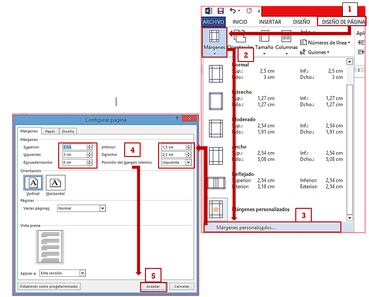 - Aparece el cuadro de configuración de página y luego ir a opción Márgenes, cambiar los centímetros de superior, inferior, izquierda y derecha.